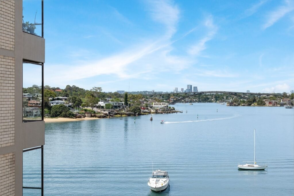 It welcomes inside to an open social centre that integrates with a tidy bright kitchen, while spilling onto a generous balcony gazing across the water and Gladesville Bridge.
